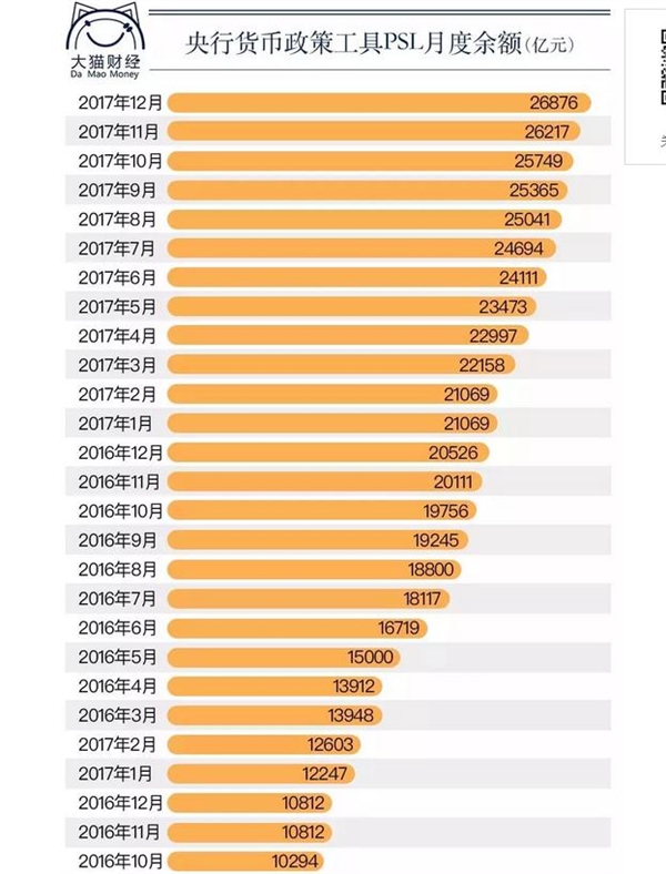 后来,央行来解决钱的问题了。央行创设PSL(抵押补充贷款)工具,通过国开行等机构发放棚改贷款。看不懂PSL这个专业名词没关系,你只要明白这是央行在放水就行。 这个工具创设之后,PSL增长曲线是这样的。如图: