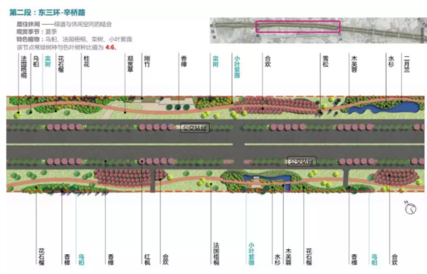 第二段为东三环——辛桥路段,将打造绿道与休闲空间结合的居住休闲区,以常绿及开花植物相搭配形成绚烂缤纷的组团,流出草坪点缀丛生大树,给周边居民提供游憩型的草坪空间;局部种植规划式的色叶地被,配以树形挺拔的乔木,营造简约现代的景观特色;