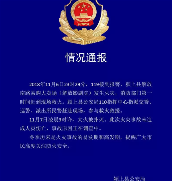 昨天晚上11时许阜阳市颍上县一商场发生火灾现场火势凶猛(资料图片)火灾发生后,消防、交警、民警、巡警等,迅速参与救援。今天(7日)凌晨3时许,火势被控制、扑灭。凶猛的火势,不禁让人担心有没有造成人员伤