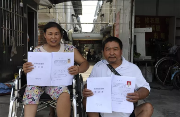 7月27日,这个普普通通的日子,注定会令倪国林、韦萍终生难忘▼这一天,这对残疾人夫妇在颍州区红十字会工作人员送来的《中国遗体捐献自愿表》《器官捐献自愿表》《眼角膜捐献自愿表》 上郑重地签下了